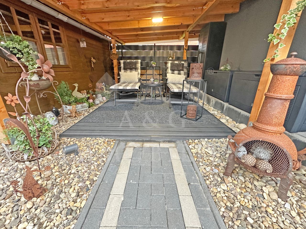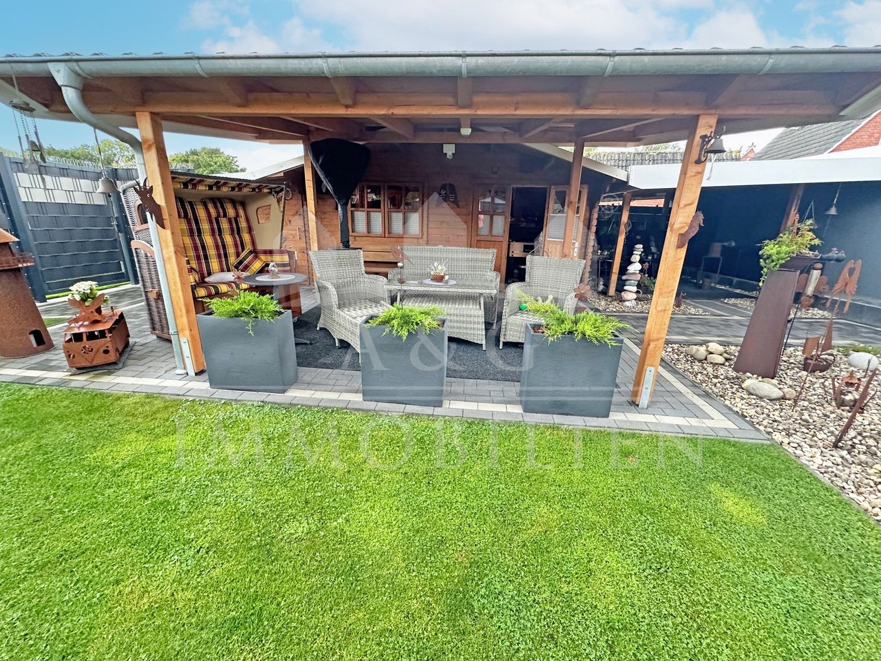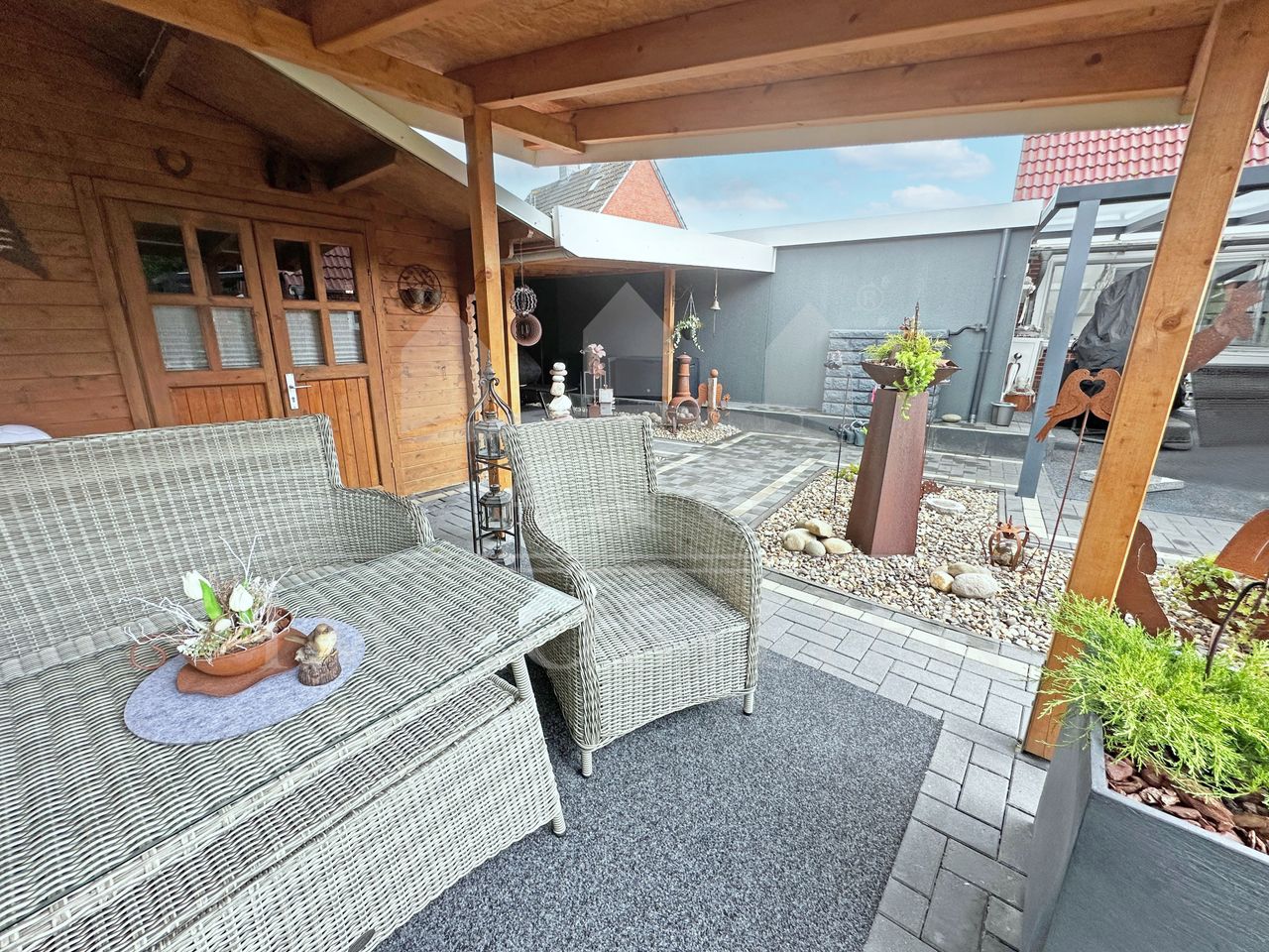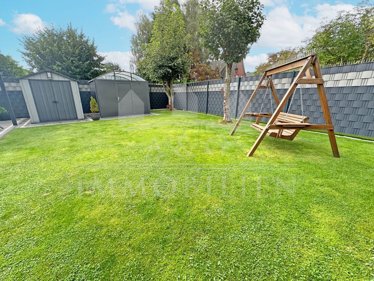 Der gepflegte Garten bietet sowohl Entspannung als auch Funktionalität – ideal für Paare oder kleine Familien, die Wohnkomfort und ein harmonisches Zusammenspiel von Innen- und Außenbereich schätzen.