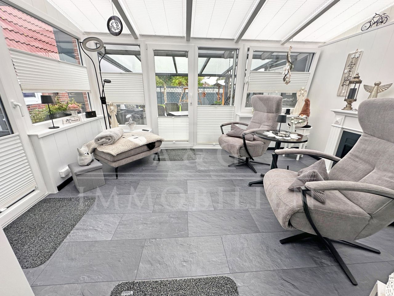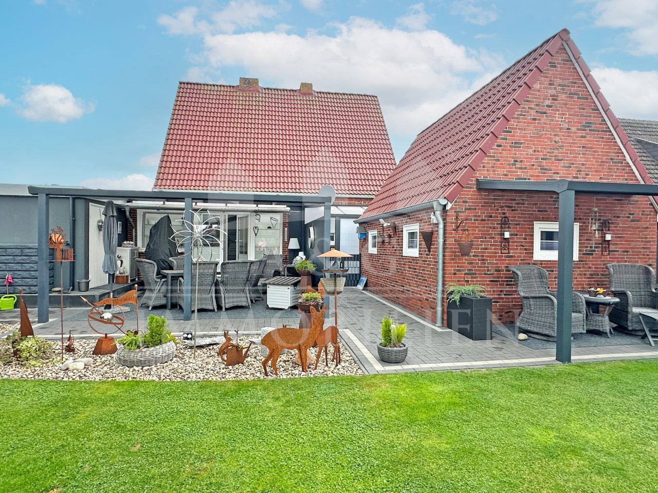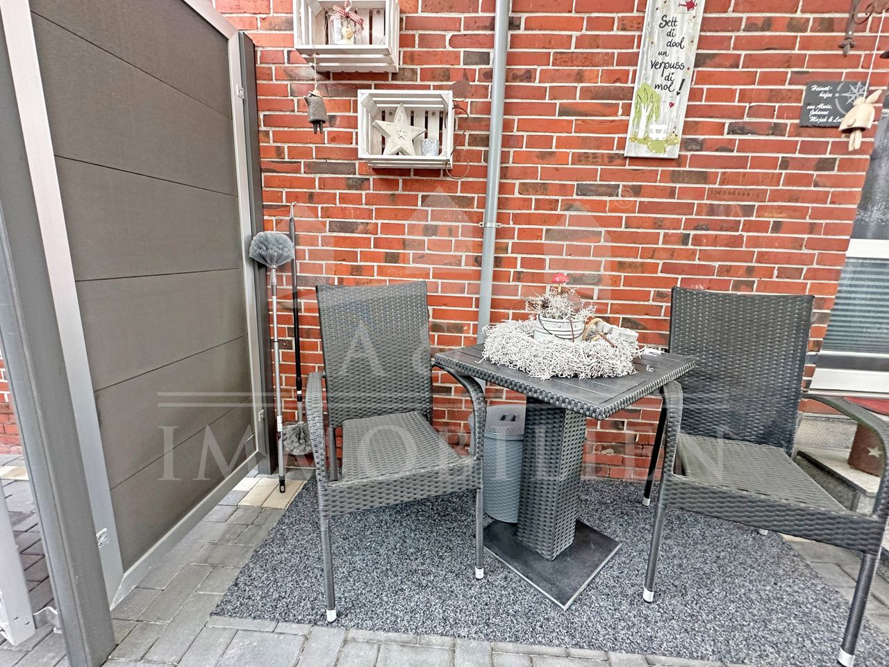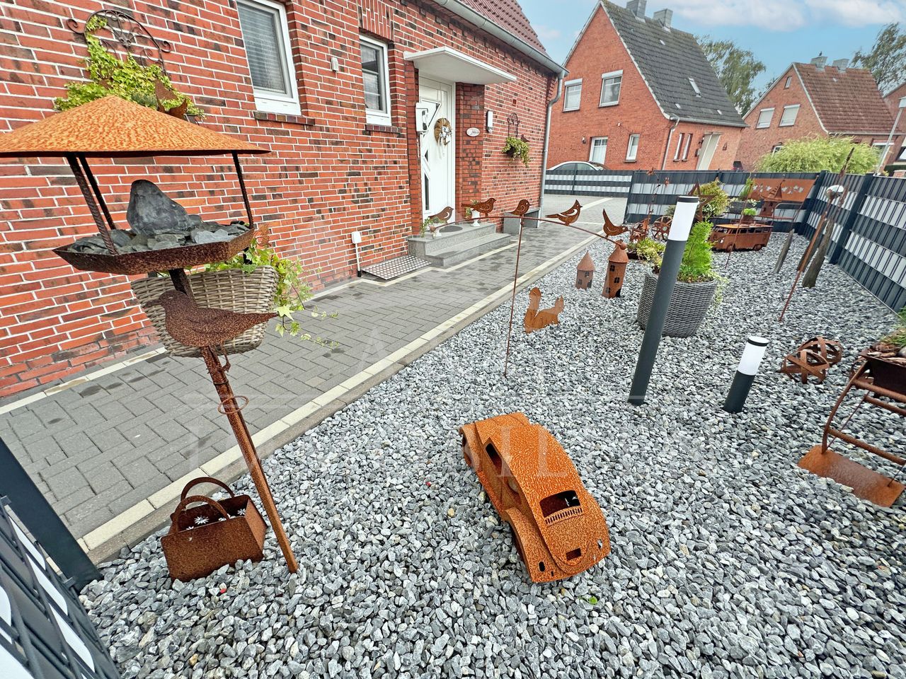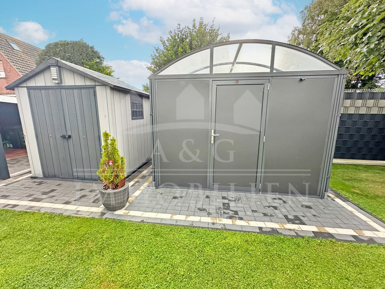 Der gepflegte Garten bietet sowohl Entspannung als auch Funktionalität – ideal für Paare oder kleine Familien, die Wohnkomfort und ein harmonisches Zusammenspiel von Innen- und Außenbereich schätzen.